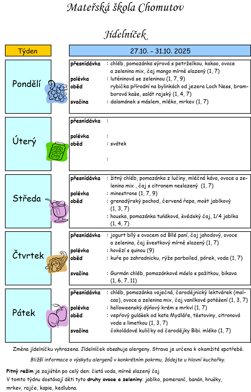 Změna jídelníčku vyhrazena. Jídelníček obsahuje alergeny uvedené v závorkách. Strava je určena k okamžité spotřebě.