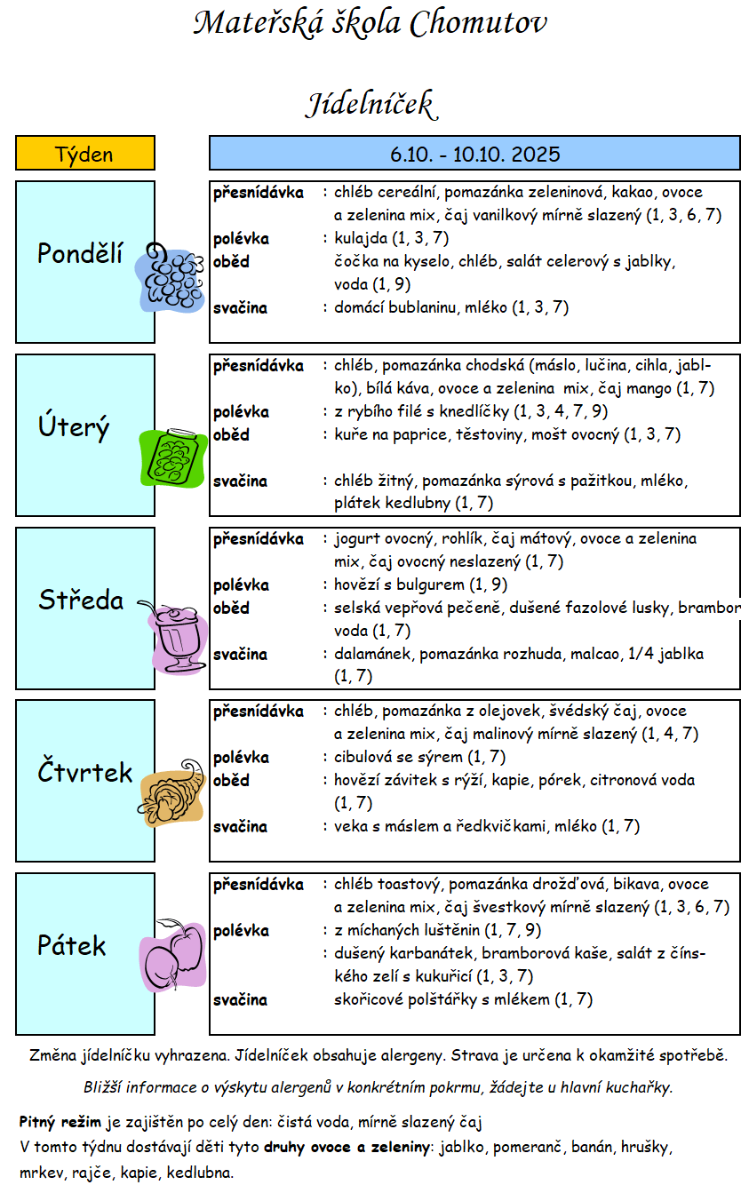 Po celý den je poskytován pitný režim – čistá voda, mírně slazený čaj, sirup. Strava je určena k okamžité spotřebě.