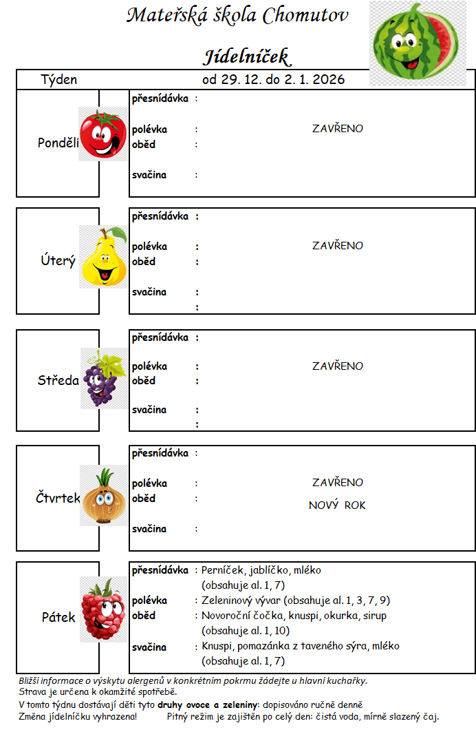 Tento týden dostávají děti tyto druhy zeleniny a ovoce: okurka, paprika, rajče, mrkev, jablko, banán, pomeranč, mandarinka.