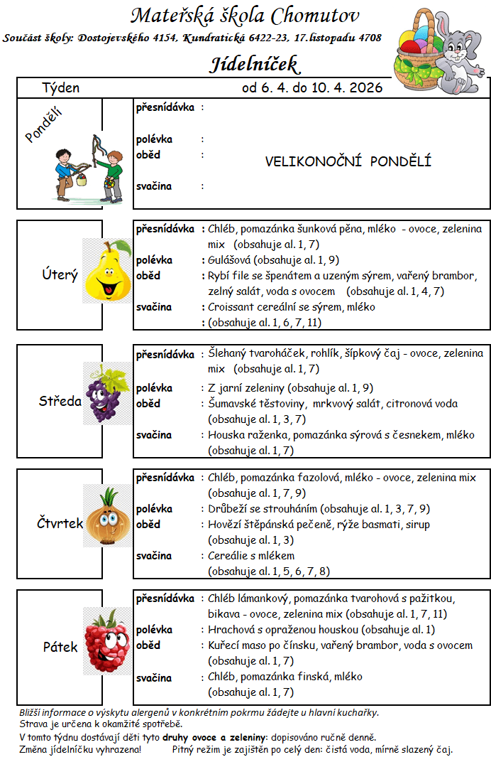 Tento týden dostávají děti tyto druhy zeleniny a ovoce: okurka, paprika, rajče, mrkev, ledový salát, banán, jablko, hruška, mandarinka, pomeranč.